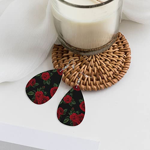 Vintage Red Rose Black Faux Leather Teardrop Earrings for Women Drop Dangle Earrings 4