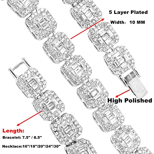 • Style/ Design:Chunky iced out chains diamond tennis necklace designs for men,classical hip hop silver and gold baguette tennis chain styles,which made with incredible details and craftsmanship;Baguette diamond cz tennis chains length:16"/18"/20"/24"/30";tennis bracelets length:7.5"/8.5".