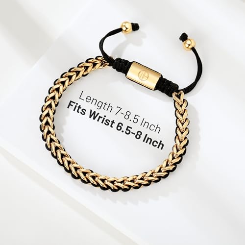 • Gold Bracelet for Men Non Tarnish - Crafted with meticulous attention to detail, this adjustable Franco Chain men bracelet features 18K gold plating guaranteeing a long-lasting and vibrant golden finish that resists tarnishing. The intricate semi-braided design is enhanced with durable nylon for added durability.
