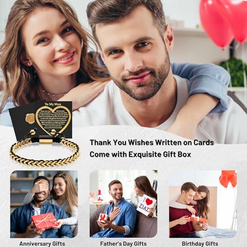 HOT ! Gifts for Man Gold Bracelets for Men Dad Son Husband Boyfriend 18K Gold Plated Franco Link Chain Stainless Steel Adjustable Beads Bracelet Birthday Forever Love