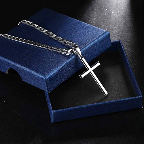 • PRODUCT SIZE: Silver cross pendant size: 1.6 inch*1.0 inch (4.0*2.5 cm), thickness: 2 mm. High polished and shiny on both sides of cross. Cuban link chain length: 16-28 inches (41-71 cm) available, chain width 5 mm. Strong and smooth edge cross necklace with upgraded lobster clasp.