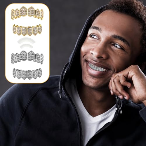 Soulchen 2 Set Vampire Teeth Silver Gold Diamond Grills for Your Teeth for Men Women 18k Gold Plated Hip Hop Rapper Costume Halloween Cosplay Extra Molding Bars 5
