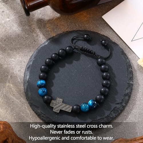 Patriotic Christian Cross Bracelet - Adjustable Blue Tiger Eye Beads Bracelet Faith Jewelry Gift for Students & Young Professionals Men with Scripture Card 6