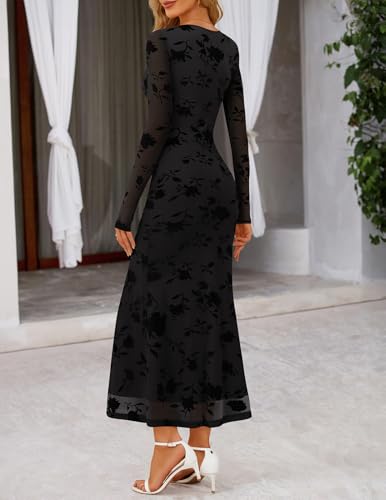 • Features: This women's cocktail dress features floral velvet pattern, long sleeve, maxi length, elastic mesh fabric, round neck, with stretch lining no see-through, slim fit, ruffled hem, ruched side, wedding guest dress, maxi dresses, bodycon dresses for women, fall dresses for women 2025, tea party dresses for woman