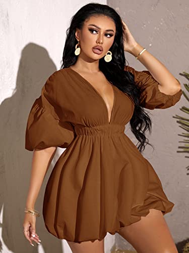 • Features: deep v neck, puff sleeve, high rise, elastic waist, flare hem, solid color, mini dress