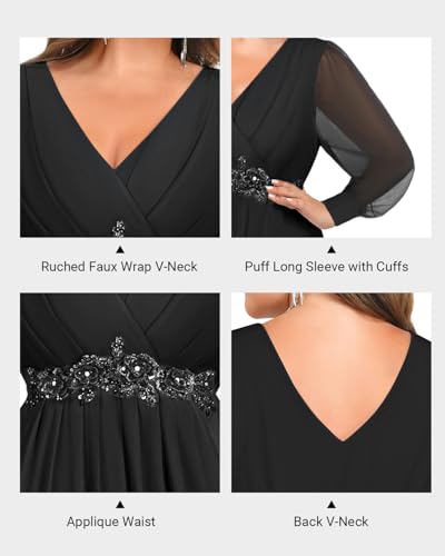 • Features: The black formal dress features a ruched faux wrap v neckline, long puff sleeves with buttoned cuffs, an appliqued waist, a back V neckline, and an a-line silhouette.