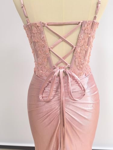 Spaghetti Strap Sweetheart Satin Prom Dress with Split Lace Appliques Corset Mermaid Long Evening Gowns 6
