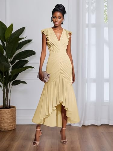 Women Chiffon Elegant Party Prom Dress Sexy Wedding Guest Dresses V-Neck Cocktail Dress with High-Low Hem 4
