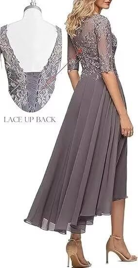 • Features: A Line,Boat Neck,Lace Appliques,High Quality 100D Chiffon,Lace-up Back Instead of zipper closure, the dress will have an adjustable size of 3-5cm. You may need help when tying it up!Tea length,Built in bra ,lace up back you can adjust the tightness easily