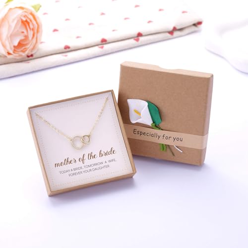 • Wedding Day Interlocking Circle Necklace: Celebrate your wedding day with a heartfelt gift that speaks volumes. This Mother of the Bride necklace is a beautiful way to honor the mom who's been by your side through every chapter of life. Featuring two interlocking circles - one embellished with sparkling crystals - it symbolizes eternal love and the unbreakable connection between a mother and her daughter
