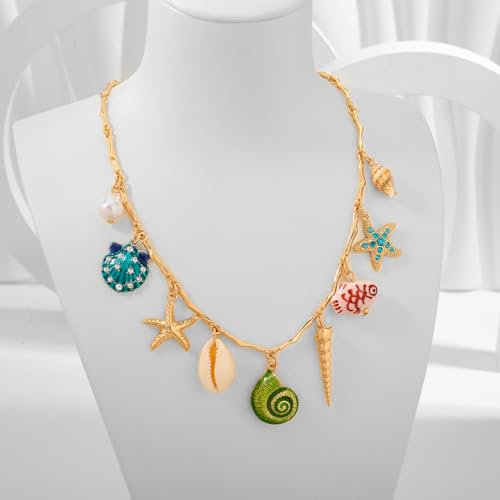 • Ocean-Inspired Design : The HolidayQbee sea shell necklace stands out with its vibrant colors, drawing inspiration from the diverse beauty of the sea. Featuring a combination of starfish, shells, conches, and pearls, along with a gold chain, this necklace perfectly embodies the harmony of nature and art.