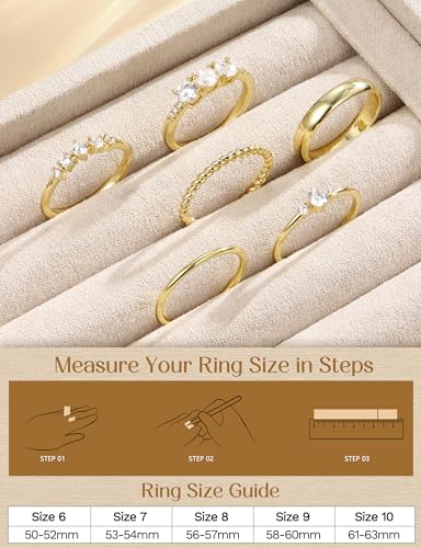 • Stacking Rings Size: These 14K gold plated ring set are available in different sizes 5 6 7 8 9 10 (US size), this stackable rings collection fits all finger types - thumb rings, pinky rings, knuckle rings, midi rings. The lightweight, unbreakable design ensures all-day comfort, making them perfect as engagement rings for women, wedding rings for women, promise rings, anniversary rings, etc