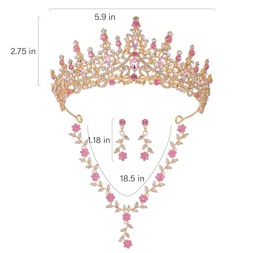 • Queen crown Dimensions: Dia 16 cm Height 7.2 cm, Necklace: Pendant Size: 9.8*1.8 in; Chain Length (Adjustable): 19.6-22.4 in. Earrings (Pierced): 1.5*0.5 in.Each Earring Weight:3.7g. Total Weight: 38g.