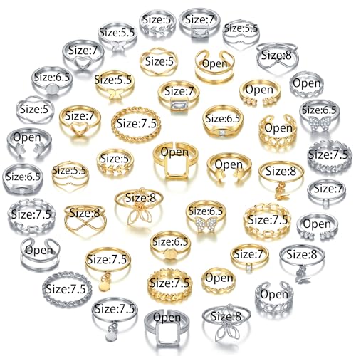 • GOLDEN KUNCKLE RINGS: You will get a 46-60 Piece golden silvery ring suit. They are divided into 2 small packages and packed in a black zipper bag. Their designs are different and mixed in multiple sizes, which can match your different clothes and occasions.