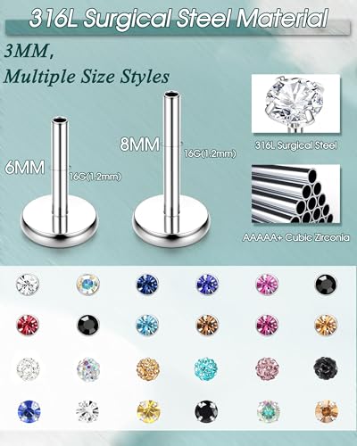 24 Pcs 16G Hypoallergenic Stainless Steel Labret Lip Monroe Medusa Stud Piercing For Women Men 3mm Cubic Zirconia Forward Helix Earrings Cartilage Tragus Piercing 6mm 8mm 6