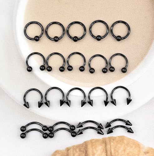 • Body Piercing Jewelry Kit---You will receive 40pcs mixed-pack body piercing in 8 style,include 15pcs Labret studs with ball or cone,10pcs horseshoe septum rings with ball or spike ,5pcs captive bead nose rings,10pcs eyebrow rings with ball or spike.You can use them as ear studs, nose studs, nose rings, navel rings, cartilage,tragus,tongue studs, septum rings, lip rings, labret rings, belly button studs, helix, daith, rook, eyebrow studs etc.