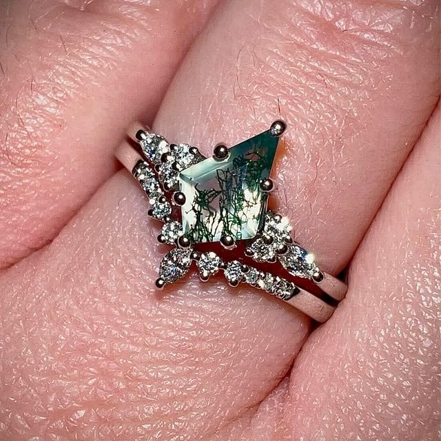 More information about Moss Agate Ring Set Kite Cut Moss Agate and Moissanite Engagement Ring for Women 925 Sterling Silver Moss Agate Wedding Ring for Her Free Engraving