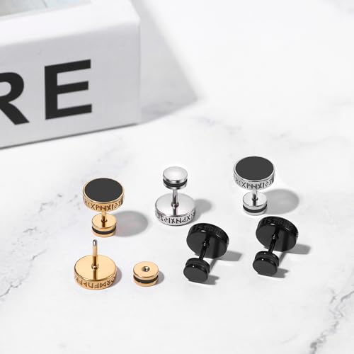 Aroncent Mens Fake Gauge Earrings: 3 Pairs Norse Viking Compass Rune Stainless Steel Fake Gauge Plugs Studs - Punk Jewelry Set Black Silver Gold 6