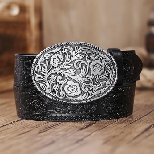 Western PU Leather Cowboy Cowgirl Belt for Men & Women - Vintage Flower Buckle Embossed Leather Belts for Jeans Pants 4