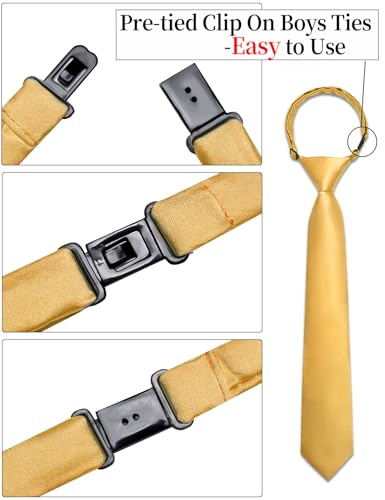 • Clip On Ties For Boys: This boys gold tie is easy to put on and stays in place,classic clip-on design adjusts for a perfect fit and removes in seconds.