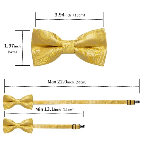 • 【Adult and Boy Bowties】Silk Gold Men and Boys Pre-tied Bowties + Parent and Child Pocket Squares + A pair of Men cufflinks. It's a surprise gift for father, husband, son,brother and friends,and all loved ones on Father's Day,Christmas Day,Valentine's Day,Thanksgiving Day,Anniversary,birthday ect