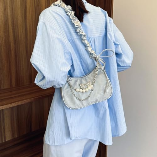 HOT ! Elegant Pearls Pleated Underarm Shoulder Bag for Women Fashionable PU Leather Crossbody Purse with Bows Decoration