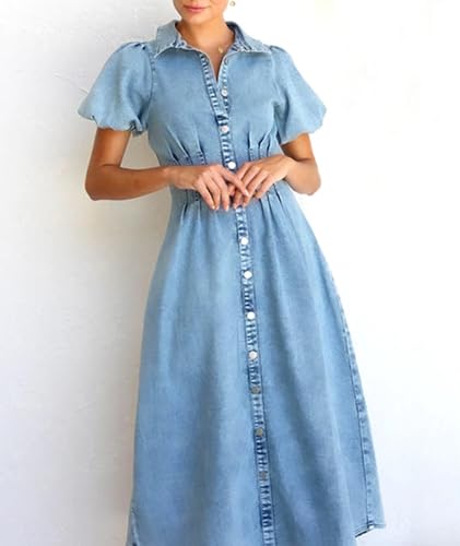 • ★☆Features☆★Denim Midi Dress,Turn Down Collar,Single-breasted,Button Down Front,Short Balloon Sleeves,Elastic Cuff,Washed Jeans Shirt Dress,Gathered Waist,Pleated,A Line Maxi Jean Dress,Blue Shift Dress