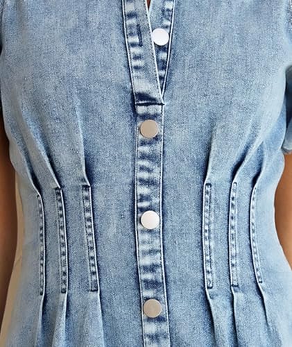 Sexyshine Women's Button Down Denim Long Dress Puff Sleeve Ruched Slim Fit High Waist Lapel Collar Jean Shirt Dress 6