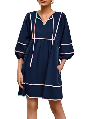More information about Cicy Bell Womens Babydoll Mini Dresses 3/4 Puff Sleeve V Neck Dress Casual Loose Fit Patchwork Pleated Swing Vacation Outfits