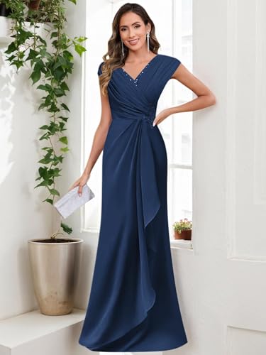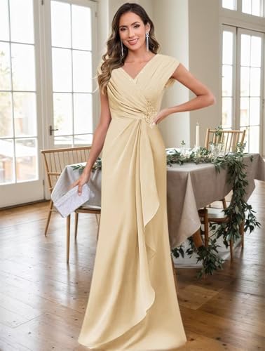 • 【Dress Designs】:Women's mother dress is made of chiffon,breathable,soft,skin friendly.It features pleated v neck and cap sleeves design.Classic floor length chiffon mother of bride dress has a multi layered ruffle dress hem which elongates your silhouette. Make you feel comfortable and elegant when wear it.