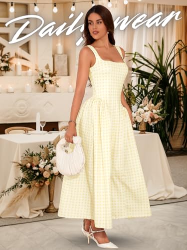 HOT ! Plaid Maxi Dress, Square-Neck Drop-Waist, Wedding-Guest Party, Flowy A-Line Dresses for Women Date-Night Pastel