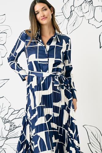 • Versatile long sleeve dress featuring pleated midi skirt, abstract geometric print, collared neckline, button-front closure, and self-tie belt. Perfect as a cocktail dress, wedding guest dress, or business casual dress.