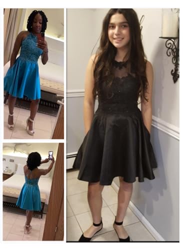 More information about Satin Lace-Applique Homecoming Dresses Short with Pockets Halter Cocktail Dresses for Teens WD029