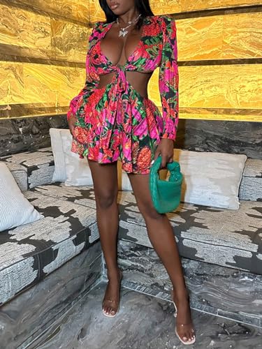 HOT ! Women's Sexy Summer Tropical Mini Dress Y2K Deep V Cut Out Dresses Long Bell Sleeve Vacation Tie Front Sundress