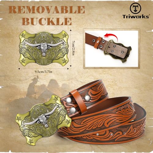 • MEN WESTERN BUCKLE BELT: Our men western leather belt features a beautifully feather embossed strap with vintage longhorn designed western buckle, capturing the essence of Western cowboy charm.Whether you're riding in the rodeo or just adding a touch of country flair to your everyday outfit, this mens country leather belt is a statement piece that exudes both western style and durability.