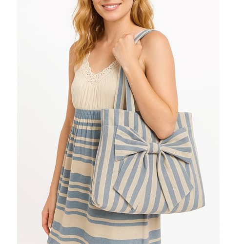 HOT ! Bow Purse Oversized Stripped Tote Bag with Bowknots Large Bow Shoulder Bag Trendy Handbag Cute Gifts for Women