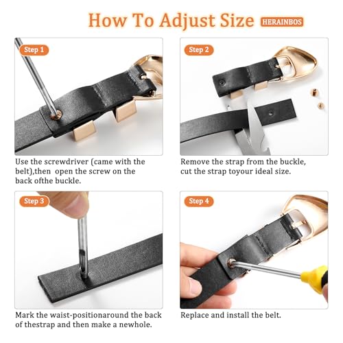 • 【Premium Adjustable Belt】HERAINBOS skinny PU leather womens belt, crafted with a removable screw design, with adjustable bold gold buckle that transforms casual outfits into chic statements. The 1" skinny belt contours your waist while gold belt buckle elevates jeans, dresses or business casual outfits for women