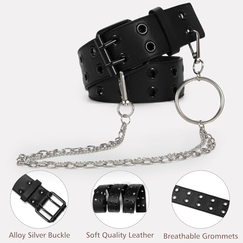 Women's Double Grommet Punk Belt with Chain Genuine Leather for Jeans 5
