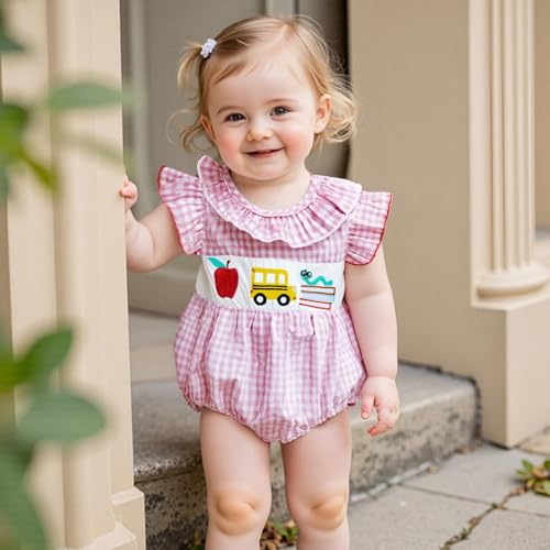 Back to School Outfits Baby Girl First Day of School Smocked Bubble Romper Onesie Newborn Cute Summer Clothes 6