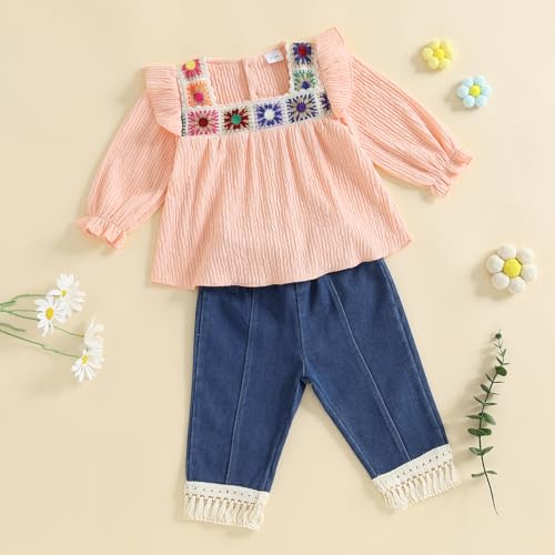 VISGOGO Toddler Baby Girl Crochet Outfit Floral Crocheted Camisole Top Linen Tassel Bohemian Floral Tops + Denim Pants Set 7