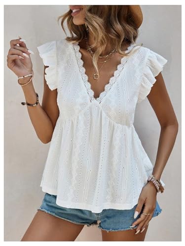 HOT ! SweatyRocks Women's Lace Trimmed V Neck Ruffled Sleeve Flared Eyelet Tank Blouse Top