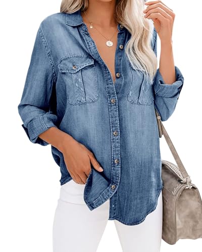 • Casual denim shirts for women, button down, long sleeve can roll up, turn down collar, v neck, loose fit tunic tops with chest pockets, classic oversized design, lightweight, classic work office shirt blouse.