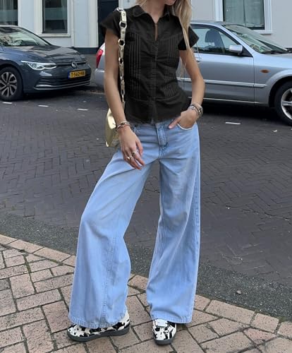 HOT ! Cicy Bell Womens Short Sleeve Button Down Shirts Pleated Slim Fit Summer Dressy Casual Blouses