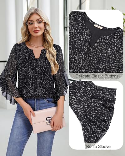 • 3/4 Ruffle Sleeve Design - The light and airy ruffled sleeves will make you feel comfortable and breathable.The 3/4 sleeve length covers our upper arms and elbows just right, it's practical and elegant. The flared ruffled cuffs won't make you feel constricted or depressed, and they also accentuate our slim little arms and elongate the arm line.If you are looking for a garment that can show your elegant temperament, the ruffled sleeves are definitely a good choice!