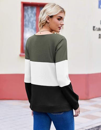 Zeagoo Women Waffle Knit Tops V Neck Long Sleeve Tunics Color Block Casual Blouse Fall Fashion 2025 Button Decor T Shirt 2