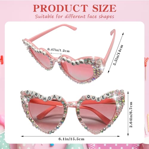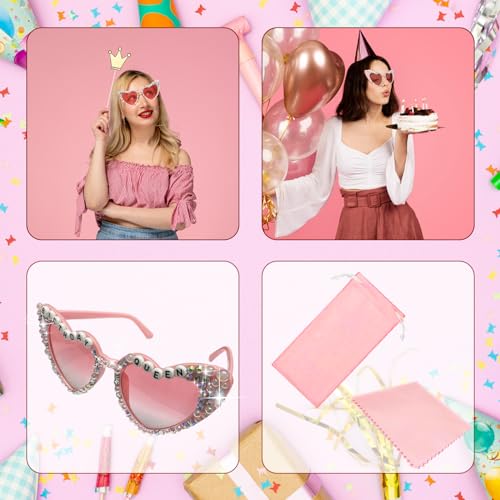 • 【Package Includes】The set includes a "Birthday Queen" heart glasses, 1 pink sunglasses pouch, and 1 pink glasses cleaning cloth. Pink heart-shaped glasses adorned with sparkling rhinestones and pearl, featuring 'BIRTHDAY QUEEN' embellishments, ensuring you stand out at the party. The included pink glasses cloth and pouch are designed for convenience and protection