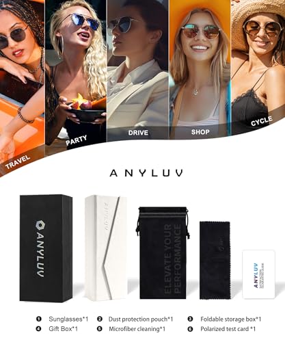 • UV400 Protection & Anti-Glare: ANYLUV women sunglasses offer superior protection against harmful rays, ensuring your safety and enjoyment during outdoor activities. The anti-glare coating minimizes reflections, providing clear vision in bright conditions.