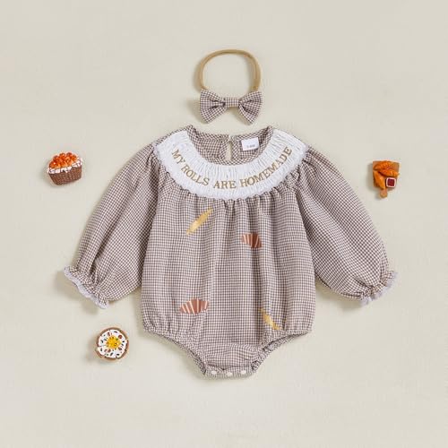 • Feature: Baby girl thanksgiving romper, baby girl thanksgiving onesie, newborn baby fall outfit girl, infant girl thanksgiving bodysuit, infant baby girl romper thanksgiving, embroidery with letter of “My rolls are homemade”, plaid bread candy print, long sleeves, round neck, back button closure, convenient to take on and off. Matching with headband