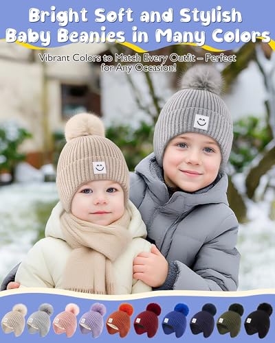 3 Pack Baby Winter Hats with Earflaps, 2 Size Kids Pom Pom Beanie for Infant Toddler Children, Smiley Face Hat for Girls Boys 4