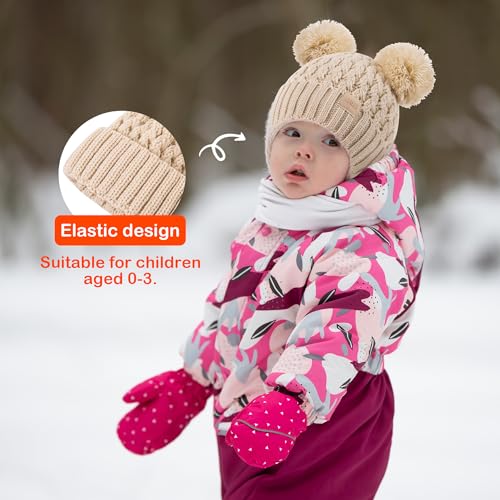 Toddler Winter Beanie Hat, Infant Winter Warm Knit Fleece Lined Cap for Girls Boys with Pom Pom for 0-36 Months 2 Packs 1